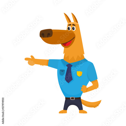 Funny Shepherd Dog Character In Blue Police Uniform Blowing