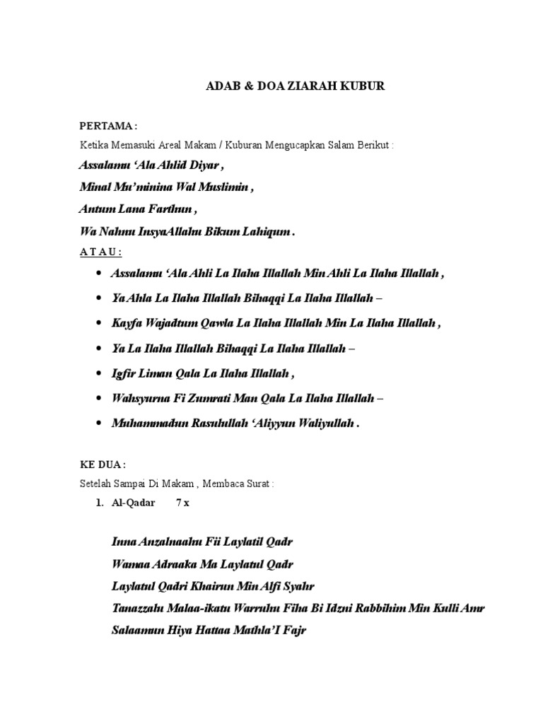 Bacaan doa ziarah kubur hukum tata cara masuk makam singkat lengkap ziarah kubur merupakan saah satu aktivitas yang sudah membudaya di kalangan umat islam terutama pada waktu watktu tertentu seperti menjelang ramadhan hari raya idul fitri atau hari jumat. Juga doa itu berisi permintaan semoga penghuni kubur diselamatkan dari siksa kubur dan azab neraka. Pada saat ziarah kubur dianjurkan memperbanyak dzikir dan doa.