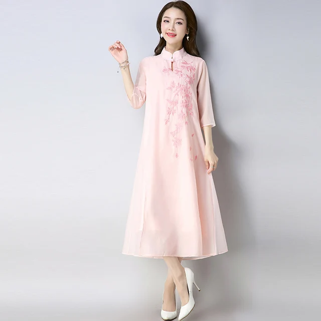 Us 39 99 2018 Musim Panas Cheongsam Desain Bordir Pendek Lengan Chiffon Betis Panjang Gaun Wanita Baru Pakaian Merah Muda Biru Di Dresses Dari